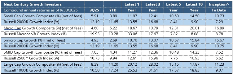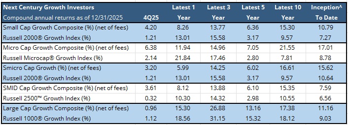We seek to invest in the fastest growing and highest quality companies in America. We believe a portfolio consisting of high-quality growth companies, combined with a strong sell discipline, will lead to both compounding of portfolio value and better performance than the unmanaged index over the long-term.